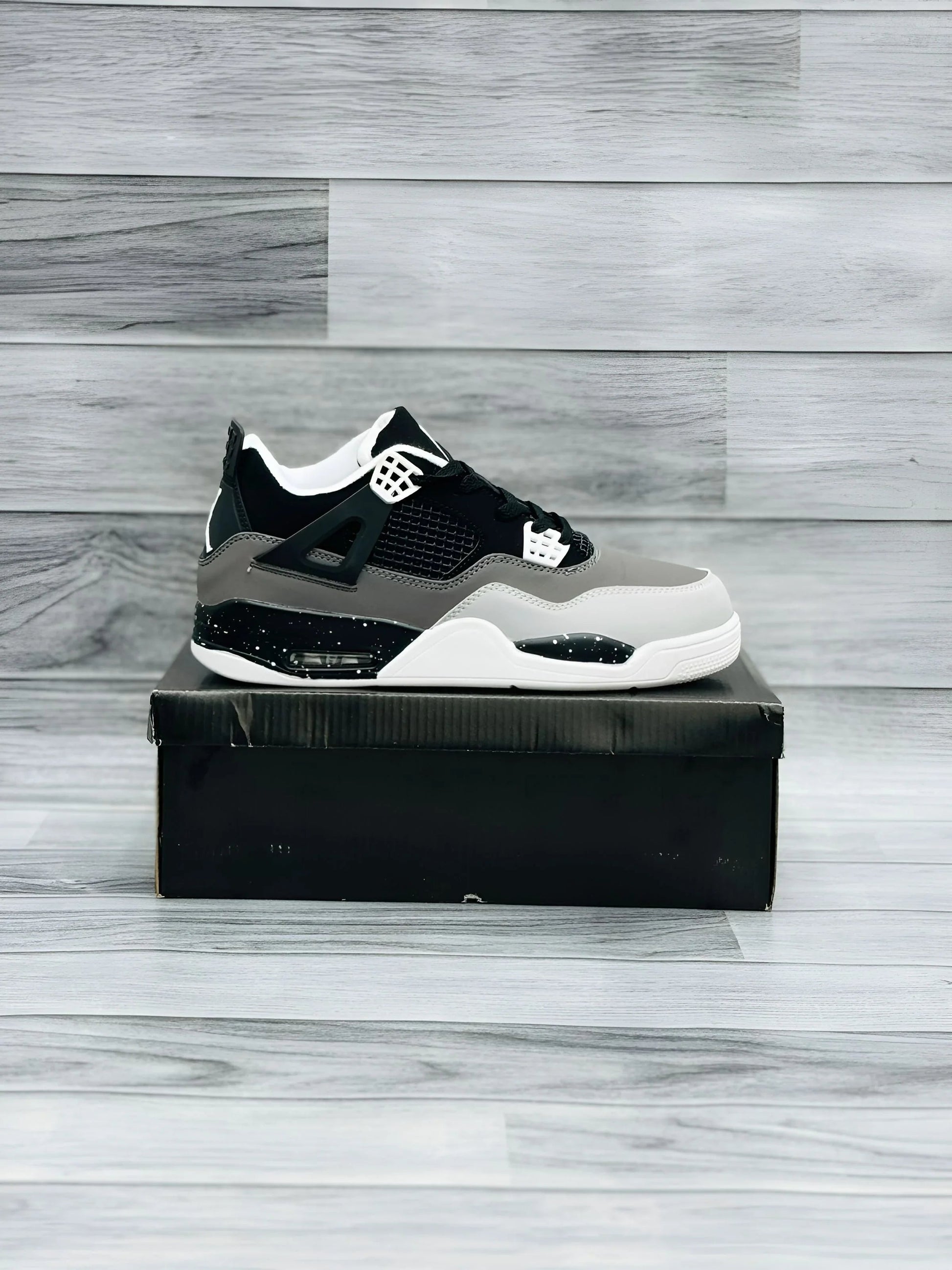 The AIR JORDAN 4 -Black Grey White sneaker is a classic retro-style shoe with an unmistakable ' Black Grey' look, crafted from premium leather with the iconic elephant print and color way of the AJ4. Embrace tradition-breaking bravado and enjoy the signature basketball style of the Jordan eponymous brand