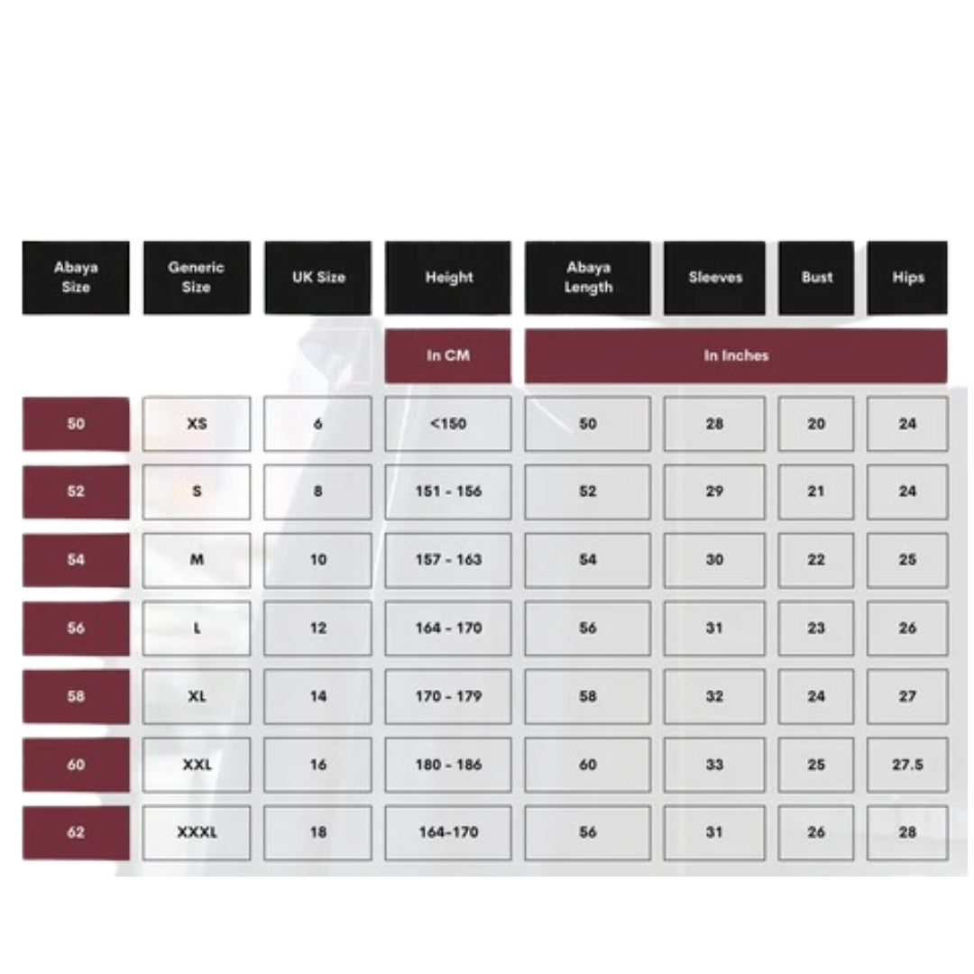 Available in all sizes, from 50 to 62, our abayas ensure a flattering silhouette for every body type. The graceful design, measuring 55 inches in length, is complemented by a stylish stole, making it a versatile addition to your wardrobe.